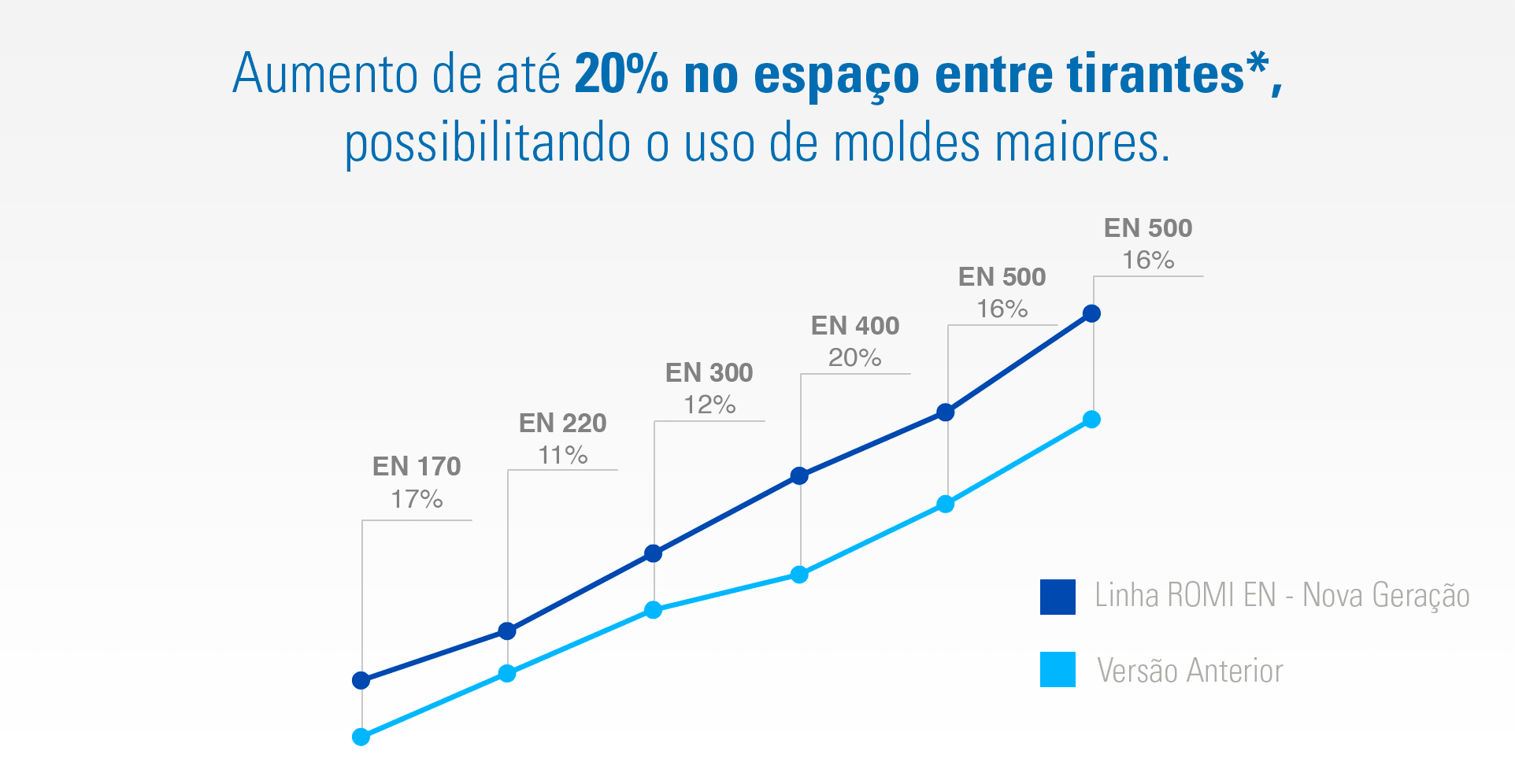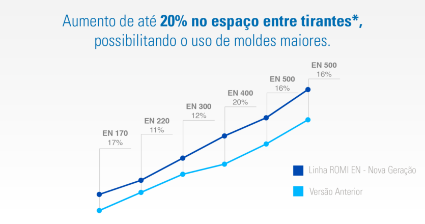 Grâce aux nouvelles dimensions de l’unité de fermeture, les machines de la Nouvelle Génération ont une plus grande surface de moulage, l’augmentation de 20% dans l’espace entre les colonnes (à l’exception de la ROMI EN 70 et de la ROMI EN 100) permet l’utilisation de moules plus grandes, adaptées au tonage de la machine.